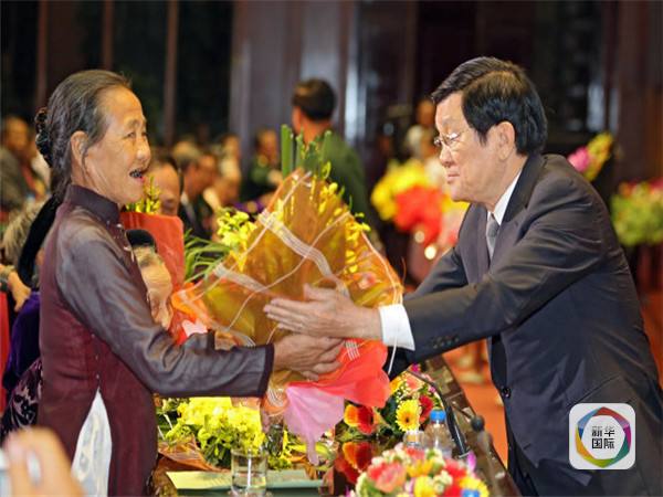 图为越南国家主席张晋创(右)在晚会上给“越南英雄母亲”献花