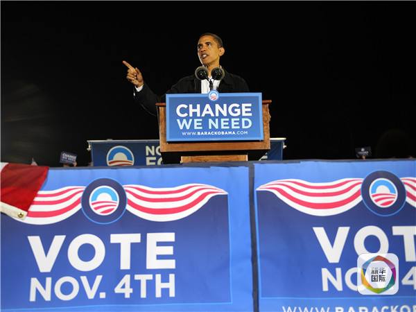 图为奥巴马2008年11月3日、即选举投票前一天,做“最后冲刺”的拉票(图片来源:新华/法新)