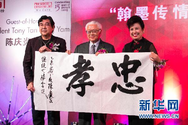 新华网新加坡频道8月4日电(实习记者向雪妮)新加坡总统陈庆炎3日在“翰墨传情”总统挑战慈善晚宴上,与艺术大师刘海粟关门弟子谢天成共同书写“忠孝”二字,为新加坡建国50周年献上贺礼,也作为“翰墨传情”艺术展活动的一部分,助力“总统挑战”慈善活动获得更多捐赠。中国驻新加坡特命全权大使陈晓东等出席晚宴。