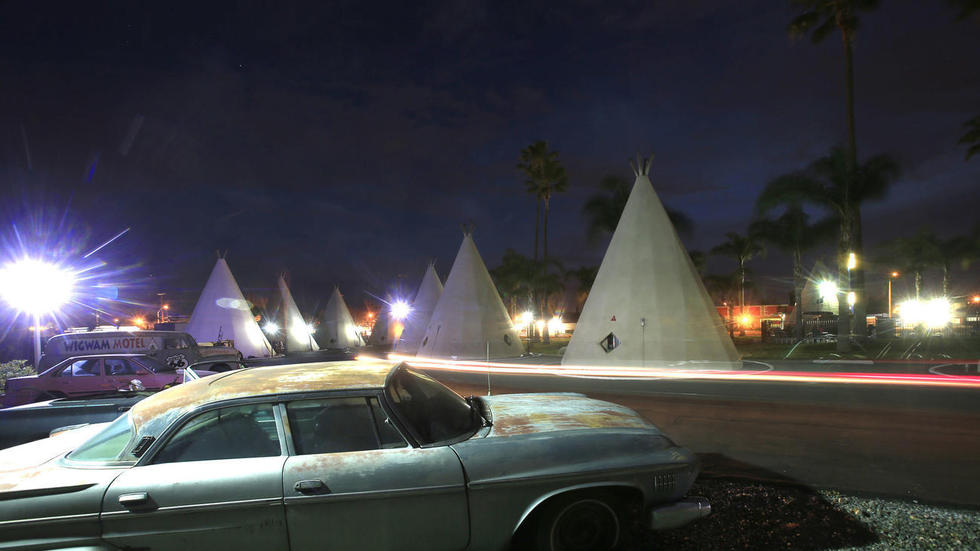 在圣贝纳迪诺,位于66号国道附近的Wigwam汽车旅馆在夜色中闪闪发亮,这里仍然经常接待摩托车骑手,以及从世界各地跑来感受怀旧公路文化的游客们。