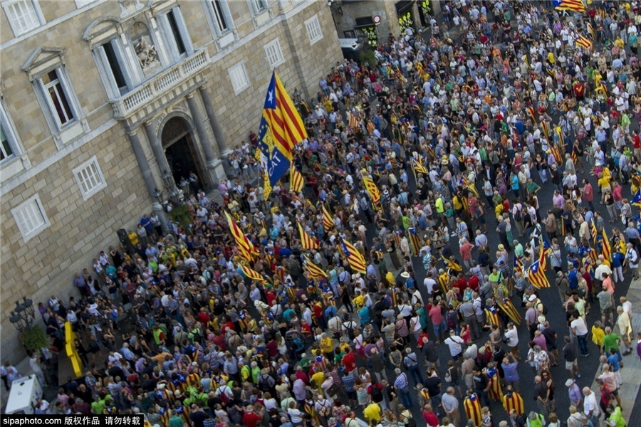 成千上万加泰罗尼亚国民会议(Catalan National Assembly)的追随者们在加泰罗尼亚地区政府的所在地圣加乌马广场上举行示威活动,支持即将于今年9月27日召开的加泰罗尼亚地区议会大选。(图片来源:Sipa)