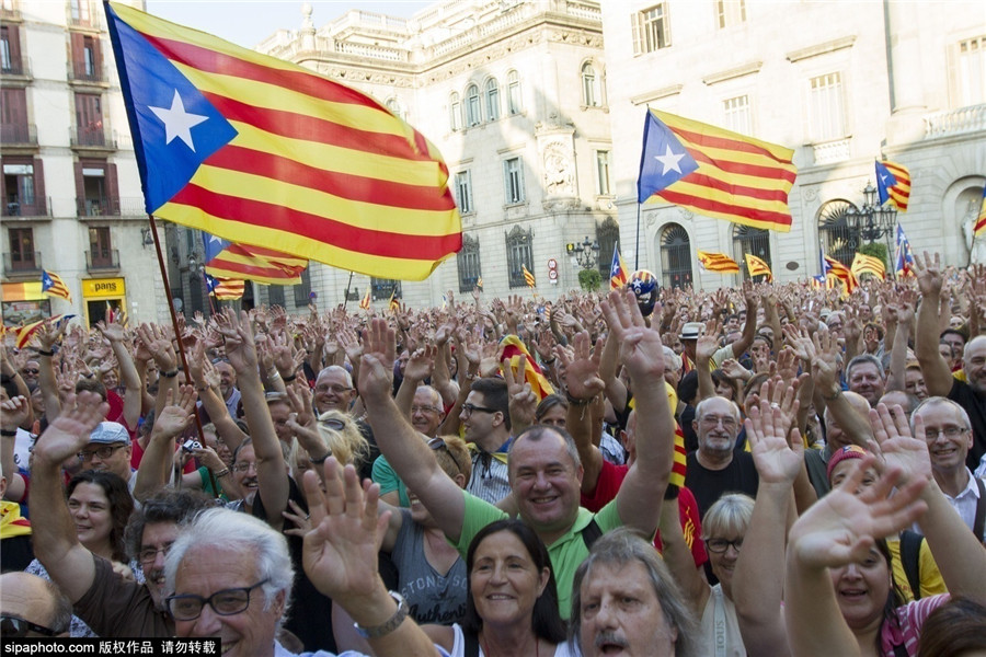 成千上万加泰罗尼亚国民会议(Catalan National Assembly)的追随者们在加泰罗尼亚地区政府的所在地圣加乌马广场上举行示威活动,支持即将于今年9月27日召开的加泰罗尼亚地区议会大选。(图片来源:Sipa)