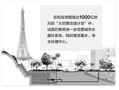 巴黎作为法国首都,其水循环系统堪称世界范围内大都市中的典范。1852年,著名设计师奥斯曼主持改造了被法国人誉为“最无争议”并基本沿用至今的水循环系统。奥斯曼的设计灵感源自于人体内部的水循环。他认为,城市的排水管道如同人体的血管,应潜埋在都市地表以下的各处,以便及时吸收地表渗水。城市的排污系统则如同人体排毒,应当沿管道排出城镇,而不是直接倾泻于巴黎的塞纳河内。奥斯曼的这一设计理念避免了巴黎市在暴雨时的地表径流量大幅增加,缓解了瞬时某一地域的排水压力。目前,法国正逐步施行雄心勃勃、拟投资额高达1000亿欧元的“大巴黎改造计划”。巴黎市政府工作人员介绍,在这项宏大的计划中,巴黎会进一步完善维护既有的城市水循环系统,同时还将在巴黎市的多个地点增添蓄水、净水处理中心,提高整个城市对雨水的收集与再利用。