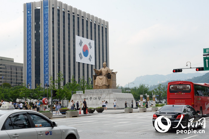 距离光复节还有半个月时间,韩国最具代表性的光化门广场附近建筑已经高高悬挂起韩国国旗“太极旗”。(夏雪 摄)