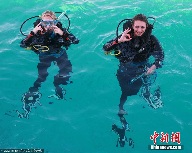 当地时间2014年4月29日,2014年英国潜水小姐选美候选佳丽亮相。众佳丽穿着泳装大秀完美身材,潜入水中与鱼类嬉戏身姿矫健。图片来源:CFP视觉中国