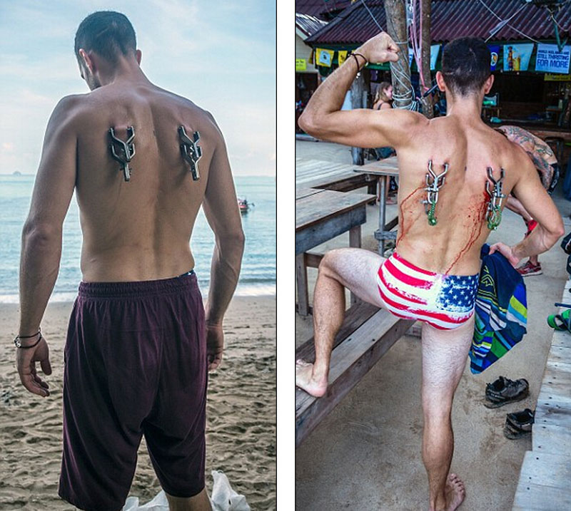 美国男子背穿金属钩玩悬浮跳伞(高清组图)