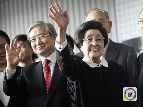 代表团团长、韩国前文化部长官金圣在(前左)与李姬镐女士向送行者挥手致意。(图片来源:新华/美联)