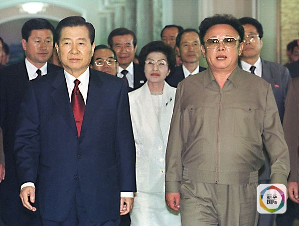 2000年6月15日,朝鲜最高领导人金正日(前右)在平壤与到访的韩国总统金大中(前左)举行会谈。中为金大中妻子李姬镐。