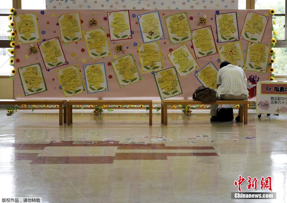当地时间2015年7月30日,日本福岛,福岛火车站内,一名游客坐在贴满来自日本千叶县舞滨站慰问信的标牌前。