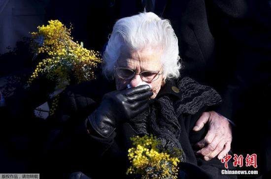 图为一名遇难者的家属在揭幕仪式现场,为逝去的亲人献花。