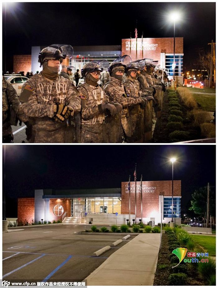 上图:当地时间2014年8月20日,美国密苏里州弗格森,民众游行抗议弗格森案,一抗议者在麦当劳附近被警方逮捕。下图:当地时间2015年7月20日,美国密苏里州弗格森市,弗格森警察局前空荡的停车场。