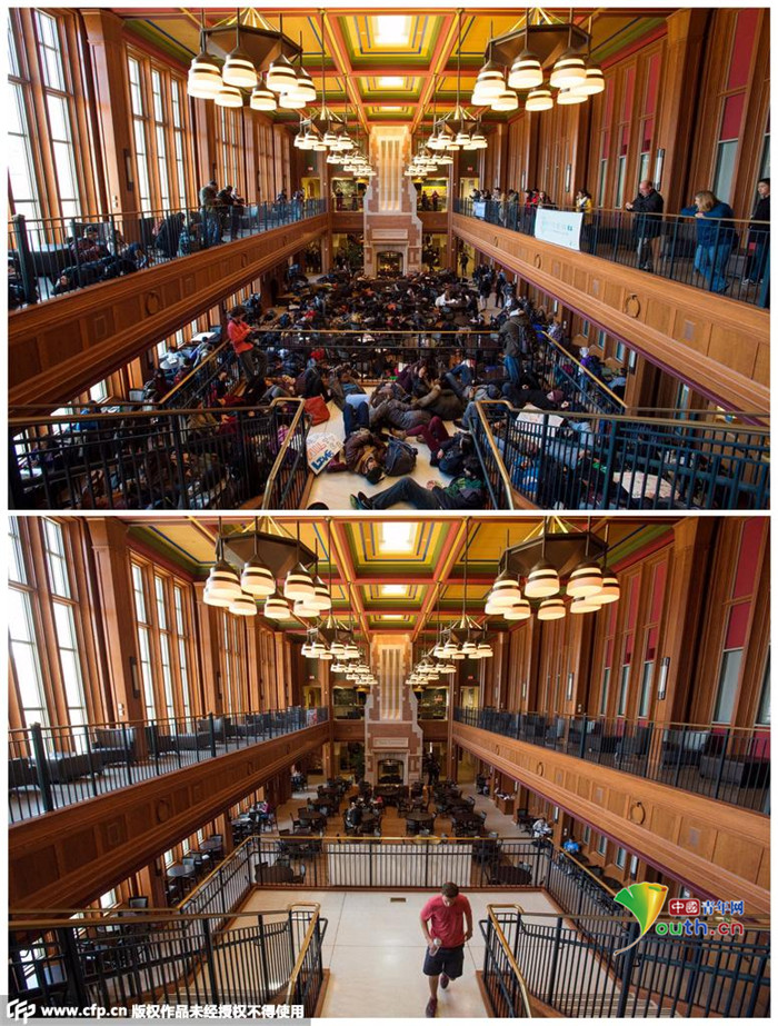 上图:当地时间2014年12月1日,美国密苏里州圣路易斯,圣路易斯华盛顿大学 (Washington University in St. Louis)的学生在会堂内“躺尸”抗议,要求为弗格森案中被枪杀的18岁青年布朗(Michael Brown)讨回公道。下图:当地时间2015年7月23日,美国密苏里州圣路易斯,圣路易斯华盛顿大学 (Washington University in St. Louis)的会堂内,一名学生走过。