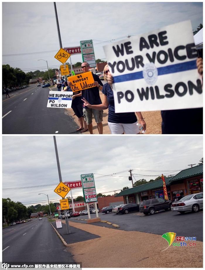 上图:当地时间2014年8月23日,美国密苏里州圣路易斯,弗格森警察威尔逊(Darren Wilson)的支持者在Barney's体育酒吧前集会。下图:当地时间2015年7月22日,美国密苏里州圣路易斯,Barney's体育酒吧前的停车场。