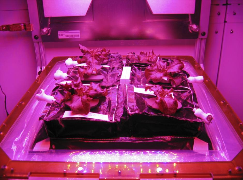 这一太空植物种植计划首批栽培了6株莴苣,由粉红LED灯提供光合作用所需光线。莴苣在太空中生长周期很短,一旦种植,28天后就能成熟到可以食用的程度。 图片来源:NASA官网