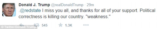 “我想你们了,谢谢各种支持。政治正确正在毁掉我们的国家,”他说。