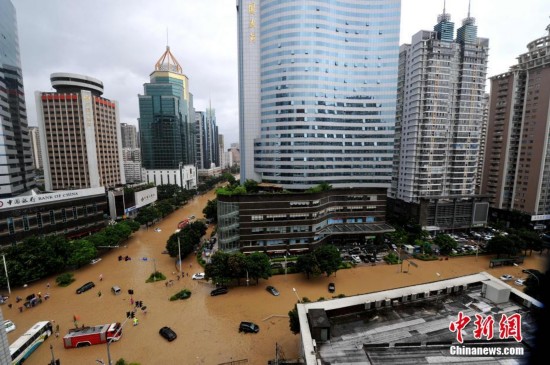 8月9日,福州市区最繁华路段五四路已变成“河流”,消防救援车和许多私家车被浸泡在水中。今年第13号台风“苏迪罗”,给福州带来了超过300毫米的特大暴雨,导致福州市区许多小区和路段受淹,情况严重。 中新社发 张斌 摄