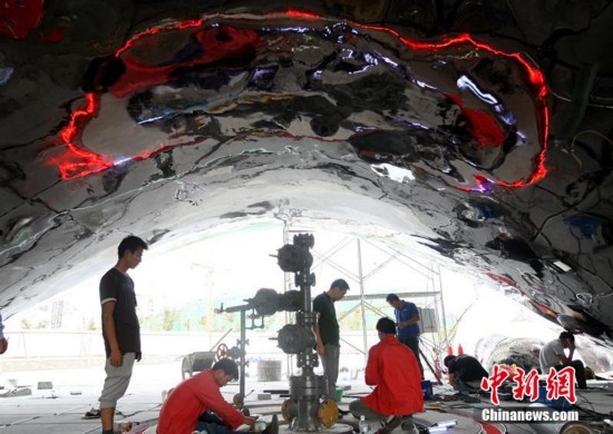 施工人员正在克拉玛依一号井“大油泡”底部施工作业。 周建玲 摄
