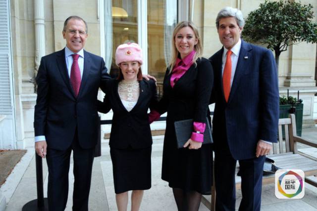 推文中还附上了俄外长拉夫罗夫与美国务卿克里一次会晤的照片,照片是两位外长和两国外交部门官员共同的合影,其中包括普萨基和扎哈罗娃。俄代表团在那次会晤中向普萨基赠送了一顶粉色的苏联毛帽。