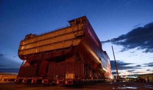 该底座模块重11200吨,是舰船船体最大的组成部分,高20米,长80米,包括飞机库、机器库、任务系统室和住宿室。它已经被运到一艘航海货船上,目前在做固定工作,为之后8月到罗塞斯的初航做准备,将在那里完成总装。
