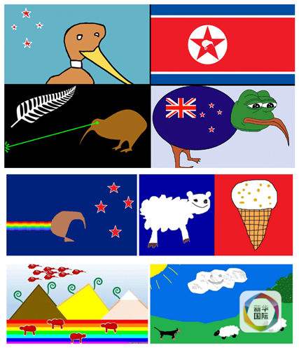 在新西兰总理约翰·基的力推下,5月5日开始,新西兰政府向全国民众征集新国旗的设计方案。民众和不少民间团体发挥才智,在互联网上发布了各种创意十足的国旗设计图,其中不乏采用带着激光眼的新西兰国鸟“几维鸟”、山羊、冰激凌塔、猕猴桃等逗趣元素。