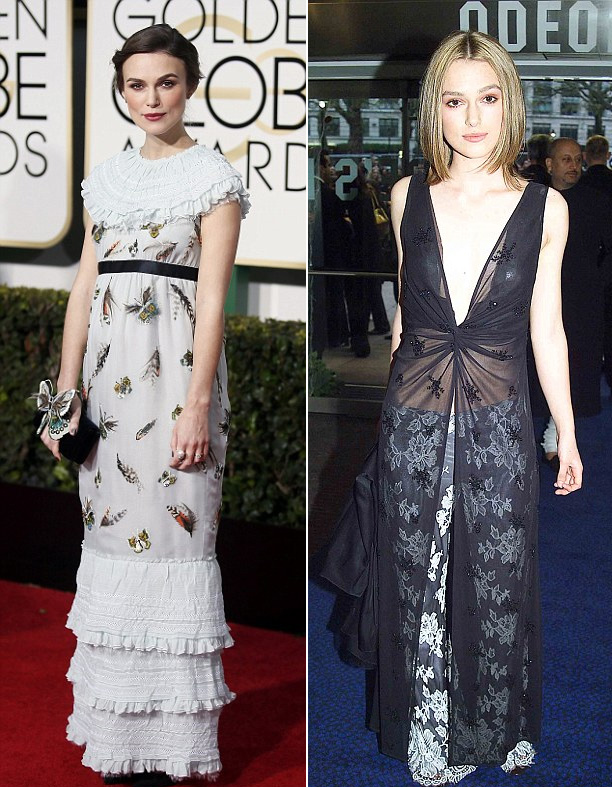 左图香奈儿可可小姐凯拉·奈特莉 多次以完美形象出现在红毯上(左图),右图是她17岁那年的头一次红毯亮相。
