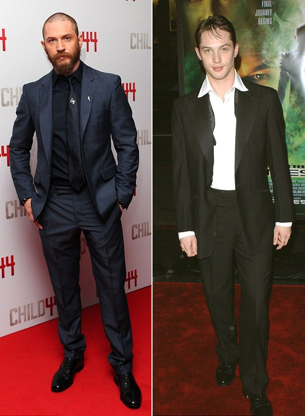 曾出演《疯狂的麦克斯》的演员汤姆·哈迪穿着一套修身西装(左图),和之前的形象(右图)。