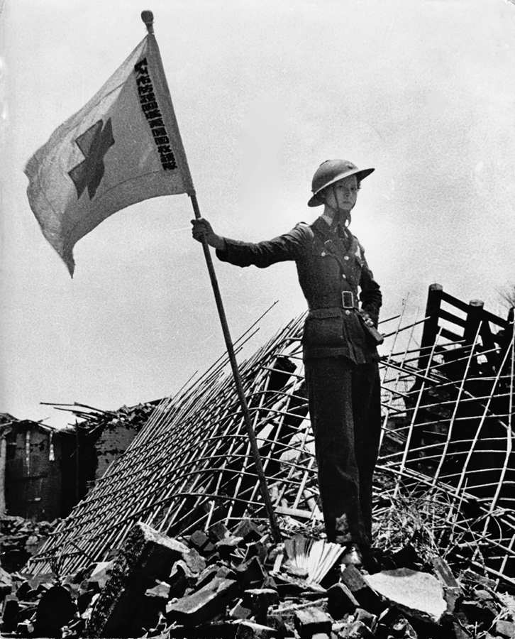 战时广州学生。这些爱国的男女青年组织起来,进一步加强民族抵抗力量。他们中的每个人都尽自己最大的能力帮助抗战,年长的学生从军参战,医学科的学生和中学生共同成立了紧急救护队。这张照片讲述他们不知疲倦地救助那些深受战争伤痛的人的故事。这位紧急救护队的女学生在被炸毁的房屋废墟上,竖起了红十字会的标准旗帜。
