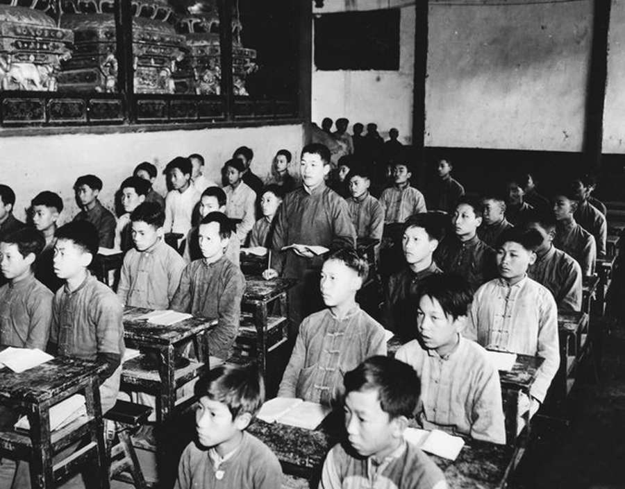 1945年7月22日,中国昆明,17岁的李文广(音Lee Wen Kuang)脑海里和幻想中充满了对军旅生活的向往,他正在昆明郊外的村庄小学的课堂上背诵课文。李文广是同学中已经决定参加学生军的男孩,即将报名参加中美训练营的无线电培训班。李文广将接受八周的无线电收发报课程培训,毕业后立即奔赴前线。 摄影师:路易士.瑞克佐科斯基(Louis Raczkowski)技术军士美军通信兵。华盛顿国防部公共关系局发布。