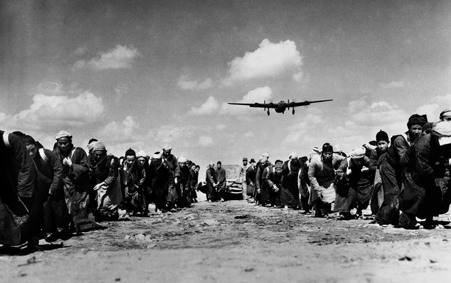 1944年3月31日照片所示体现了现代机械与传统民工的强烈对比, 表现这群民工奋力拖拉一个巨石碾子滚过跑道, 用血肉之躯铺筑通往民族解放之路。