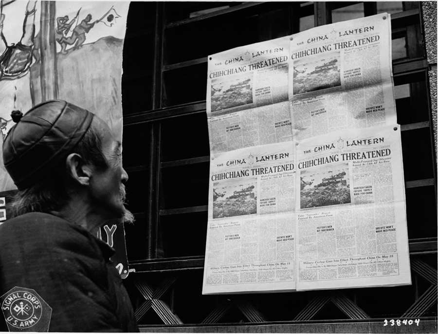 1945年5月8日。中国昆明,一位老者正在目光聚焦在在中国战区的官方报纸叶中国灯笼上,头条标题报道日本军队继续威胁进攻中国腹地。旁边的海报告诉人们德国已向盟军投降。 摄影师:约瑟夫.帕桑汀诺(Joseph Passantino)中尉美军通信兵(U.S.Army Signal Corps)。华盛顿国防部公共关系局准予公开。