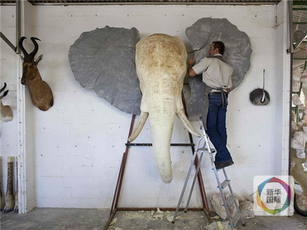 一名纳米比亚工人将一具大象头部标本的模子挂在墙上。