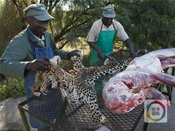 两名纳米比亚工人制作动物标本时剥下猎豹皮。