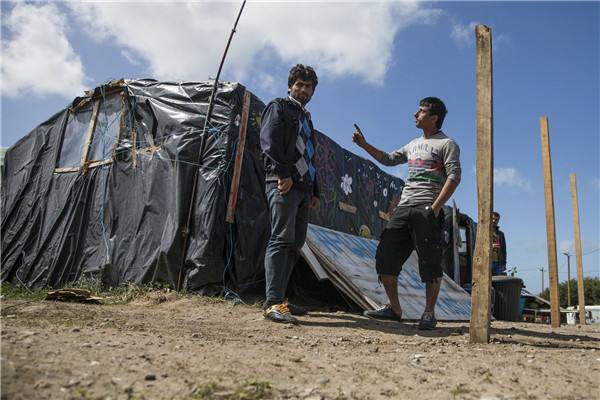 8月5日,在法国北部城市加来附近,两名非法移民在一个被叫做“丛林”的难民营里交谈。