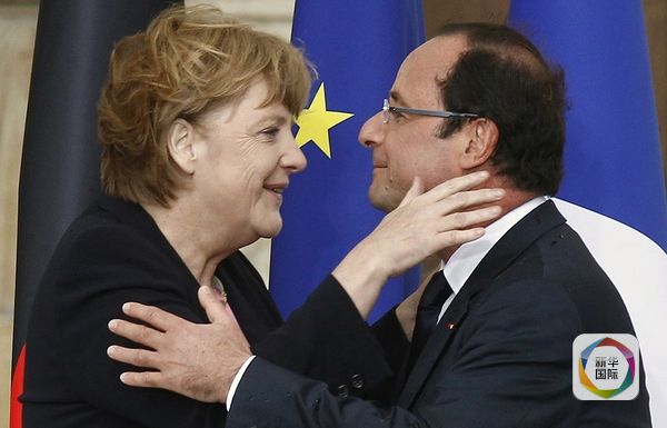 2012年7月8日,在法国东北部城市兰斯,法国总统奥朗德(右)和德国总理默克尔出席法德和解50周年纪念活动。(图片来源:新华/路透)