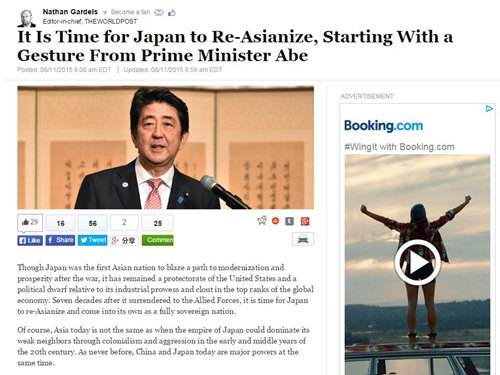 文章中说,日本如果希望在将来以“正常国家”身份重新回归亚洲新社区,就必须先从正视历史做起。日本首相安倍晋三修改和平宪法之举之所以变得如此具有挑衅性,正是因为日本官方对过去的忏悔一直未能让任何一个邻国信服。