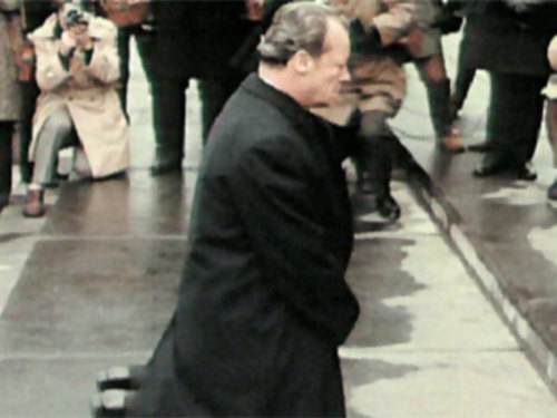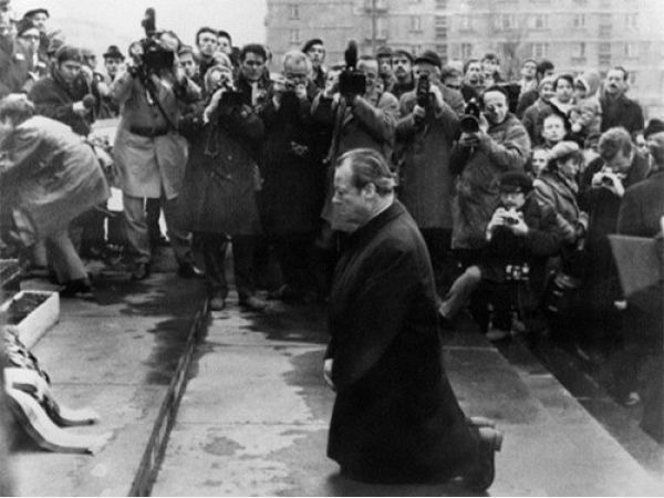 (图为时任德国总理勃兰特1970年访问波兰时在华沙犹太人遇难纪念碑前当众下跪。图片来源:美联社)