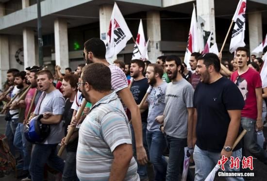 资料图:当地时间7月22日,希腊雅典,希腊民众组织大规模反紧缩游行。