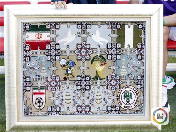 2014年巴西世界杯期间,伊朗队迎战小组对手尼日利亚队时,赠送对方一幅精致的波斯地毯手工艺品。新华社记者廖宇杰摄