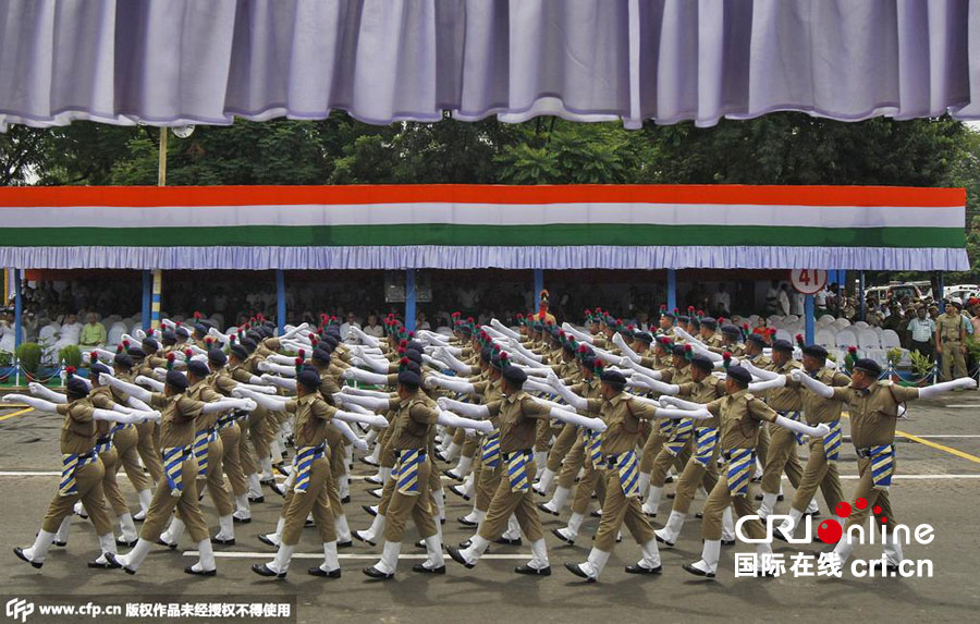 当地时间2015年8月15日,印度各地庆祝独立日,图为印度加尔各答警方游行。图片来源:CFP