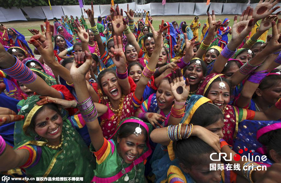 当地时间2015年8月15日,印度各地庆祝独立日,图为印度昌迪加尔学生们庆祝舞蹈表演获奖。图片来源:CFP
