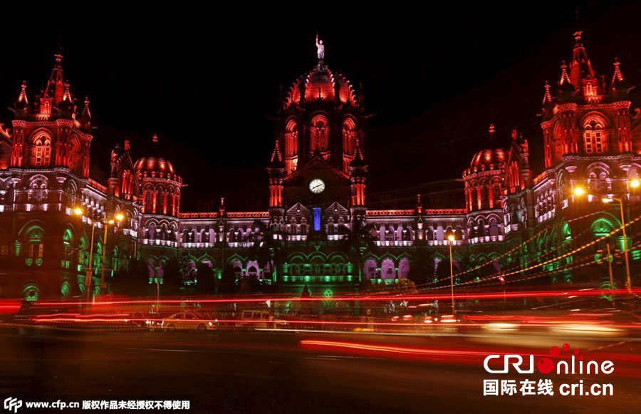 当地时间2015年8月15日,印度各地庆祝独立日,图为印度孟买希瓦吉火车站变国旗色。图片来源:CFP