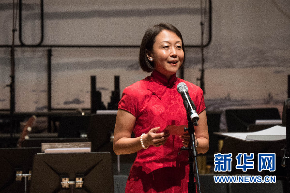 中国银行新加坡分行行长郭宁宁在“黄河”音乐会开场前致辞(王应耀 摄)