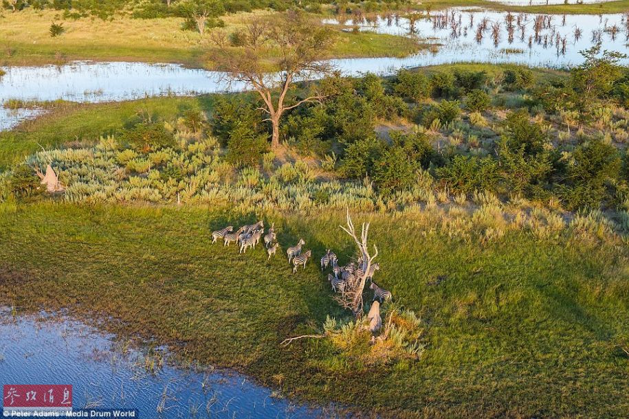 据英国《每日邮报》8月16日报道,摄影师Peter Adams乘坐直升机在博茨瓦纳奥卡万戈三角洲拍摄了野生动物活动的震撼场面。为了拍到满意的照片,Adams甚至在3000英尺(约914.4米)的上空打开舱门拍摄。