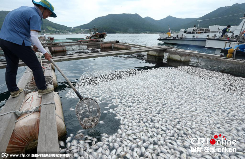 当地时间2015年8月17日,韩国巨济附近的水产养殖场赤潮蔓延,导致数十万条鱼集体死亡。图片来源:CFP