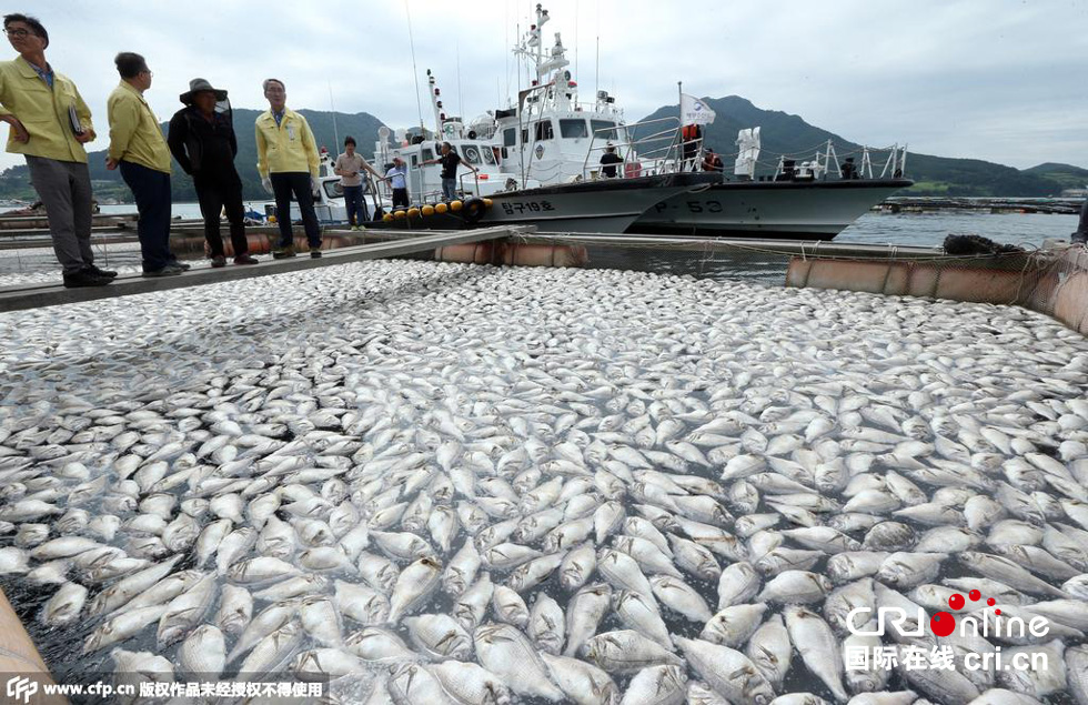 当地时间2015年8月17日,韩国巨济附近的水产养殖场赤潮蔓延,导致数十万条鱼集体死亡。图片来源:CFP