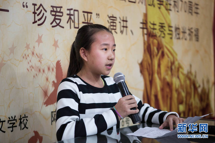 当地时间16日下午,中国驻阿使馆官员及一百多位阿根廷侨界代表齐聚首都中国城侨联中文学校,以演讲、书法秀和烛光祈福的方式,纪念中国人民抗日战争暨世界反法西斯战争胜利70周年。图为侨联中文学校一名小学生发表演讲。新华社发(马丁萨巴拉摄)