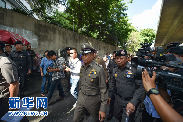 8月18日,泰国国家警察总指挥颂约·蓬潘蒙(中)在泰国曼谷昭披耶河畔的沙吞码头针对水下爆炸展开调查。新华社记者 李芒茫 摄
