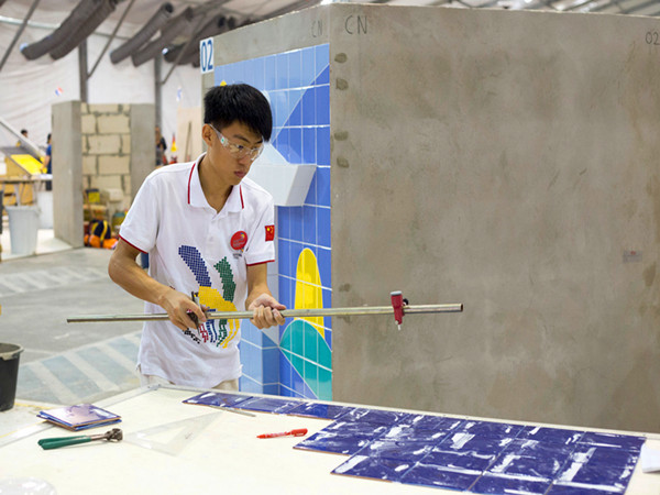 与出自泥瓦匠世家的邹彬不同,瓷砖贴面项目选手臧国才(上图)是典型的“学院派”。两年前,臧国才进入烟台城乡建设学校学习,在瓷砖贴面方面展现出优秀的天赋,成为学校重点培养的对象,并从选拔赛中脱颖而出。
