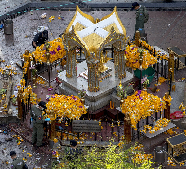 8月18日,调查人员在发生爆炸的四面佛周围取证。(新华/路透)