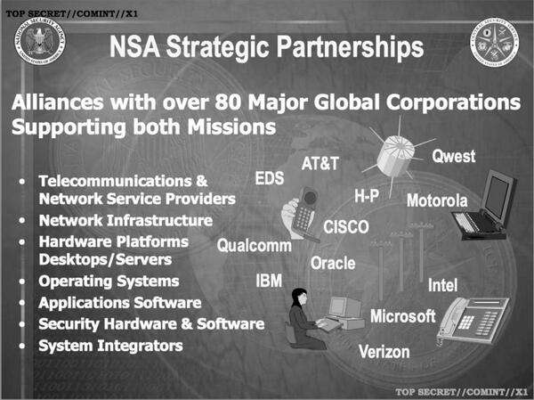 与情报部门合作的公司被视为“可信任”的伙伴,情报部门的网络监控和情报收集越来越依赖与科技公司的合作。这是因为巨量的全球互联网信息流动要经过的交换器、电缆和其他网络设备由美国公司掌控。比如,国安局的大规模监听活动依赖与美国电话电报公司的合作,双方的合作涉及范围广泛的秘密活动。美国电话电报公司通过多种方式,使国安局获取流经该公司位于美国本土网络系统的数十亿封电子邮件。国安局称双方合作关系“高度协作”。